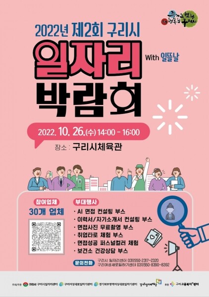 이번 행사는 10월 26일 오후 2시부터 오후 4시까지 구리시 체육관에서 진행되며 구리시가 주최하고 구리시 일자리센터, 구리여성새로일하기센터, 경기북부광역여성새로일하기센터, 경기도 일자리재단이 공동 주관하며 구리시고용복지센터가 후원한다.