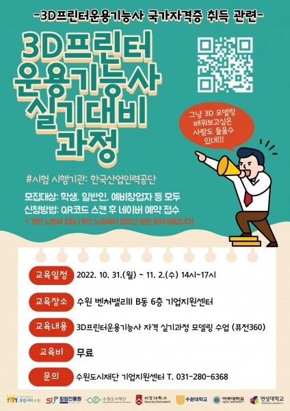 수원도시재단 홈페이지 ‘지원사업공고’에 게시된 ‘3D프린터 운용기능사 대비 교육 참가자 모집’에서 홍보물 큐알코드를 스캔하거나 네이버 예약 페이지에서 신청하면 된다.