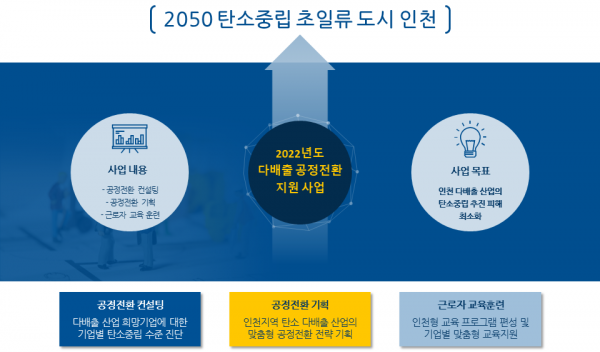 이 사업은 인천지역 탄소 다배출 산업에 대한 기업, 근로자 맞춤형 지원 및 전략 수립을 통해 탄소중립 추진과정의 피해를 최소화 하기 위한 사업이다.