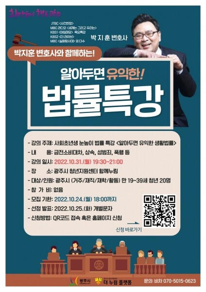 시 관계자는 “박지훈 변호사의 재치 있는 강연으로 우리시 청년들이 실생활에 도움이 되는 법률 지식과 정보를 많이 얻어갈 수 있는 시간이 될 것으로 기대된다”고 말했다.
