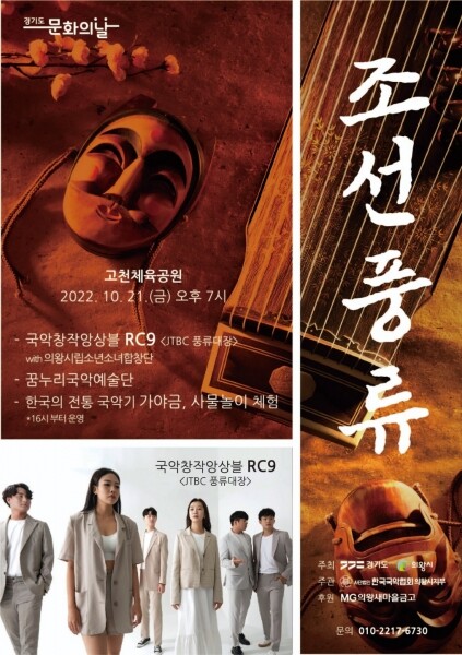 경기도 문화의 날 문화예술지원 프로그램으로 열리는 이번 행사는 공연에 앞서 한국의 전통 국악기 가야금, 사물놀이 체험 프로그램으로 국악에 대한 시민의 관심과 참여의 분위기를 만들고 본 공연에서 JTBC 풍류대장에 출연한 국악창작앙상블 RC9가 흥겨운 무대를 선보인다.