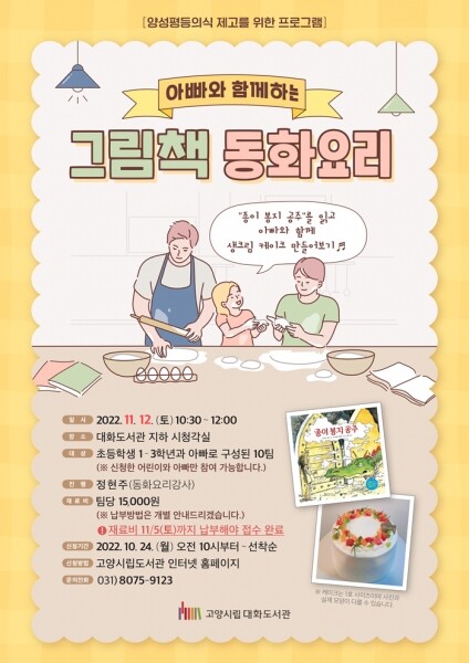 프로그램은 초등 1~3학년 어린이와 아빠로 구성된 10팀을 대상으로 11월 12일 토요일 오전 10시 30분부터 12시까지 대화도서관 지하 시청각실에서 진행된다.