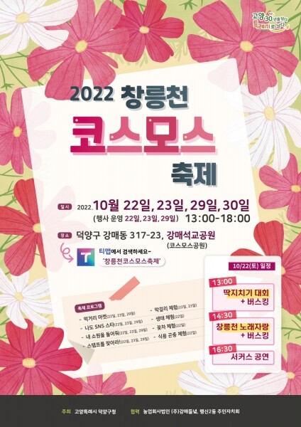 일정을 잘 참고해 가을이 가기 전에 고양특례시 2022 창릉천 코스모스 축제로 시민들을 초대한다.