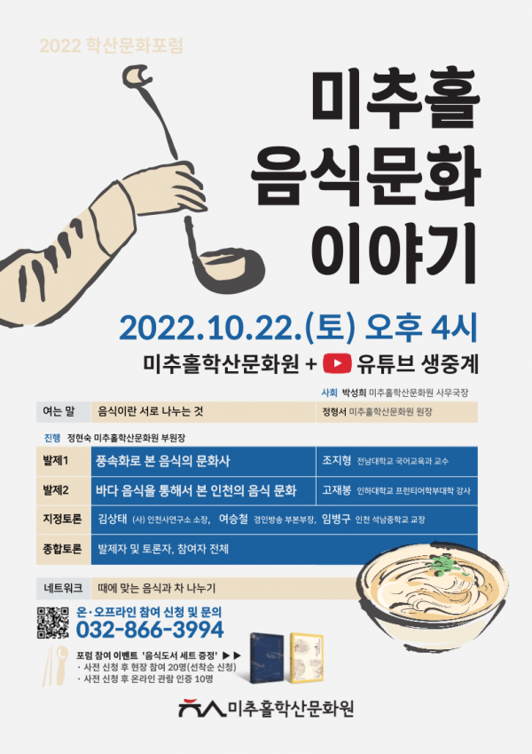 문화원 관계자는 “미추홀 시민들의 삶을 총체적으로 담아내는 미추홀학의 일환으로 지역 음식 생활사 기록과정을 지속적으로 진행 중이며 이번 포럼을 통해 음식문화의 가치에 대해 시민들의 공감대를 형성하고자 한다.