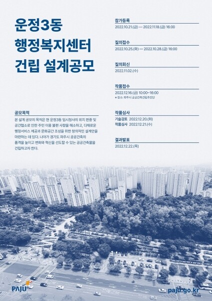 시는 행정서비스, 복지 허브 기능과 더불어 문화·예술의 기능을 수행할 운정3동 행정복지센터 청사 신축에 앞서 건축설계 공모를 마련했다.