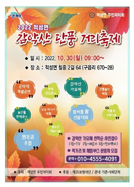‘2022 적성면 단풍거리 축제’는 제25보병사단과 관내 기관 및 단체가 후원하고 주민자치회가 주최·주관하는 적성면 대표 축제다.