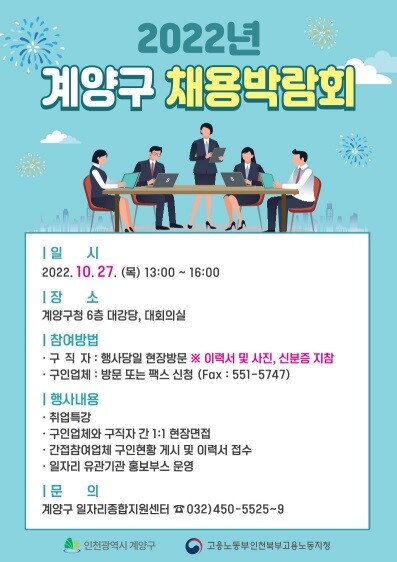 또한 계양구는 인천북부고용센터, 계양구 노인인력개발센터, 계양구 여성 새로 일하기 센터 등과 연계해 경력단절 여성, 장애인, 중·장년층 등 취업 취약계층에 대한 맞춤형 상담과 취업 지원을 위한 홍보관을 운영할 계획이라고 전했다.