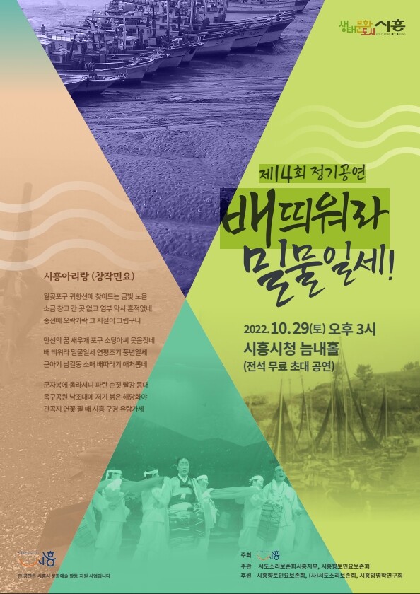‘배 띄워라 밀물일세’ 공연은 시흥향토민요 ‘배치기’를 중심으로 한 어촌 ‘새우개 마을’의 민속을 재현한다.