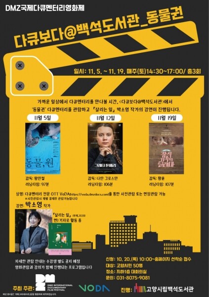 ‘다큐보다@백석도서관_동물권’은 DMZ국제다큐멘터리영화제가 주최, 주관하고 백석도서관과 협력해 진행된다.