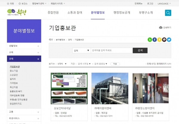 중소기업제품 홍보관은 부평구청 누리집의 분야별정보 중 경제분야에서 볼 수 있으며 기업제품 사진을 클릭하면 기업 누리집으로 연결되도록 설정했다.