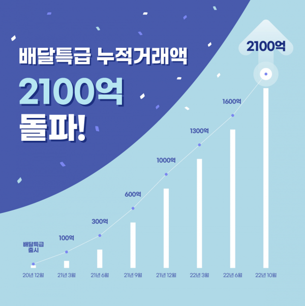 경기도주식회사는 지난 10월 23일 일요일 기준으로 배달특급의 총 누적 거래액이 2,100억원을 돌파했다고 24일 밝혔다.