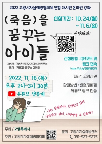 고양시자살예방협의체 생명사랑 온라인 강좌에 대한 자세한 사항은 QR코드 및 링크 접속을 통해 확인 할 수 있으며 관련 문의는 고양시자살예방센터로 하면 된다.