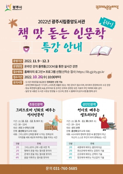 성인 대상으로는 ‘역사로 배우는 셀프리더십’이라는 주제로 11월 9일부터 11월 30까지 매주 수요일 오후 7시에 운영되며 초등인문학 ‘그리스로마 신화로 배우는 역사인문학’은 11월 12일부터 12월 3일까지 매주 토요일 오전 10시에 운영한다.