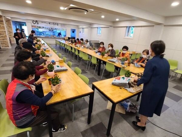 꽃보다 아름다운 시니어 프로그램에 참여한 김0자 어르신은 “수업이 있다고 해서 급식소를 오는 마음이 설레 옷을 예쁘게 차려입고 왔다”며 “예쁜 꽃을 보니 마음이 즐겁다”며 밝게 웃어주셨다.