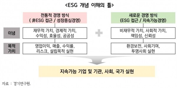 강철구 경기연구원 선임연구위원은 공공기관이 ESG 도입 순항을 하기 위해서는 “CEO의 ESG 경영 도입 및 운영 리더십 정립, 중대성 평가를 통한 공공기관의 ESG 경영 ‘핵심이슈’ 선정, 공공기관 특성을 반영한 맞춤형 ‘ESG 경영실적 평가 관리지표’ 개발이 필요하다”고 강조했다.
