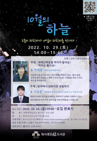 화서다산도서관 통합예약시스템 바로가기 페이지에서 과학자들의 재능기부강연 10월의 하늘’을 클릭해 신청하면 된다.
