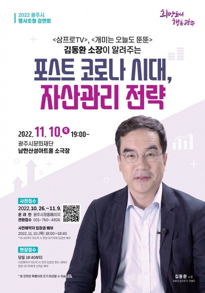 김 소장은 유튜브 ‘삼프로TV’, 카카오TV ‘개미는 오늘도 뚠뚠’의 진행을 맡은 자산관리 전문가로 이번 명사 초청 강연회를 통해 시민들에게 올바른 투자 마인드를 알려줄 것으로 기대된다.