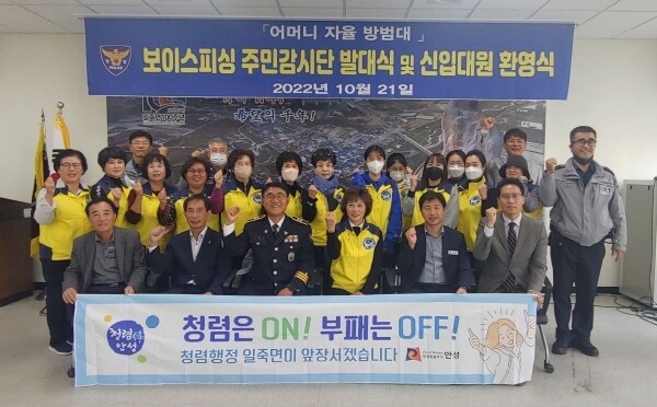 이날 결의대회는 일죽면 보이스피싱 주민감시단 발대식 행사와 함께 진행됐으며 일죽면 어머니자율방범대 대원 모두는 안전한 지역사회 조성과 함께 공정하고 투명한 청렴문화 확산을 위한 실천 결의를 다짐했다.