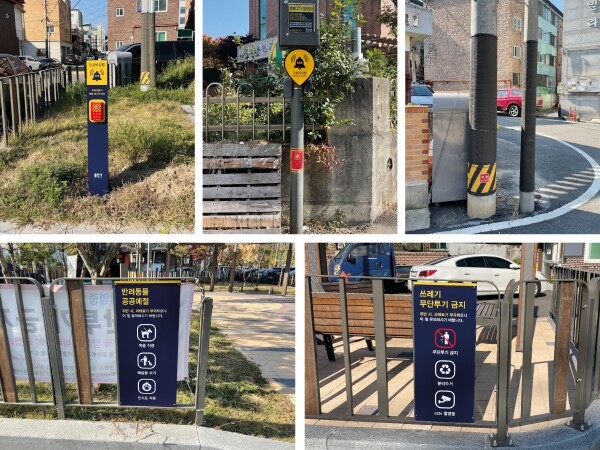 새로 개발한 시설물 디자인은 쓰레기 무단투기 금지, 반려동물 공공예절, 쓰레기 배출 방법, 마을 안전길 안내, 소공원 이용수칙 안내, 소화시설 위치 안내, 안심벨 위치 안내 등 안내사인 7종이다.