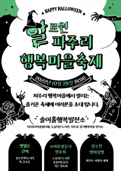 파주읍 할로윈 축제는 파주5리마을협의체, 도담작은도서관, 파주읍경기행복마을관리소가 술이홀행복발전소라는 이름으로 함께 진행하는 마을 축제다.