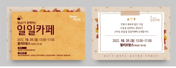 일일카페는 태성로 130-60에 위치한 ‘델리프랑스’에서 오후 1시부터 5시까지 열리며 커피, 차, 베이커리, 과일 등 다과와 올해 광남2동 지역사회보장협의체의 활동사진과 영상이 함께 전시될 예정이다.