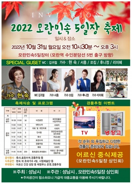 개그맨 김귀철 씨의 사회로 모란장 품바와 성남시립국악단, 초청 가수 현숙, 서홍, 쏘킴, 후니정, 리미혜가 흥겨운 무대공연을 펼친다.