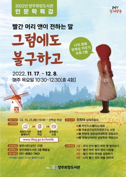 이번 특강은 빨간 머리 앤의 이야기를 바탕으로 자기를 탐색하고 회복 탄력성을 기를 수 있도록 돕는 강좌로 최희아 심리치료사가 진행한다.