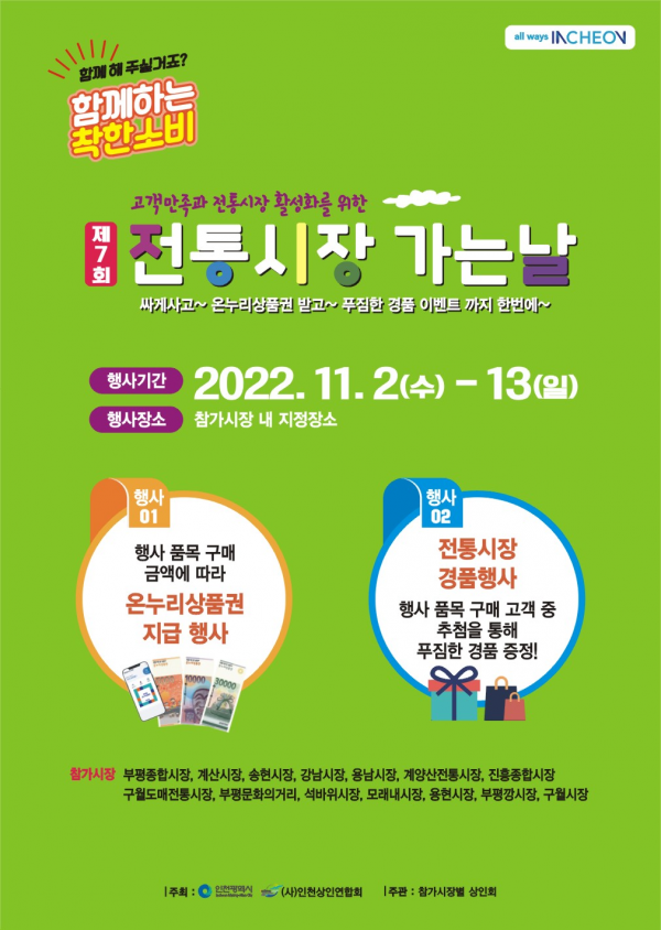 전통시장 활성화와 전통시장 이용 고객의 만족을 위해 인천광역시와 인천상인연합회가 주최하는 행사로 올해는 ‘2022년 코리아세일페스타’및 가을 김장철 시기에 맞춰 관내 14개 전통시장에서 진행될 예정이다.