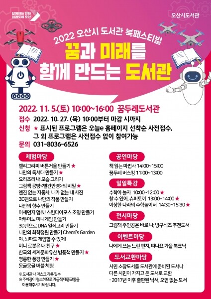 북 페스티벌 일부 체험 부스와 일일 특강은 오산시 교육포털 오늘e 홈페이지에서 선착순 사전 신청 후 참여할 수 있으며 과학 체험 부스, 공연과 전시 등은 사전 신청 없이 행사 당일 자유롭게 이용 가능하다.