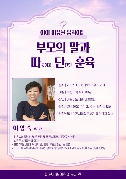 이번 교육은 ‘아이의 마음을 움직이는 부모의 말과 따뜻하고 단단한 훈육’을 주제로 맑은숲아동청소년상담센터 이임숙 소장이 강연한다.