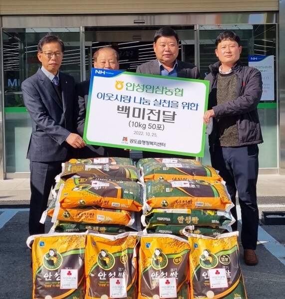 이호만 공도읍장은 “지속적인 경기 침체로 올 겨울이 더욱 춥게 느껴질 이웃들을 위해 쌀을 기부해 주신 안성인삼농협에 깊은 감사를 드리며 전달해주신 백미는 감사한 마음을 담아 필요한 곳에 전달하겠다”고 말했다.