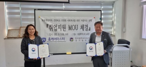 이번 협약으로 한국법무보호복지공단 경기동부지소에서는 ‘허그 일자리 지원’을 통해 법무보호 대상자의 상담, 면접 동행 등 사회복귀를 지원하고 ㈜홈케어마스터는 보호 대상자들에게 일자리를 제공함으로써 건전하고 안전한 사회복귀를 도울 계획이라고 전했다.