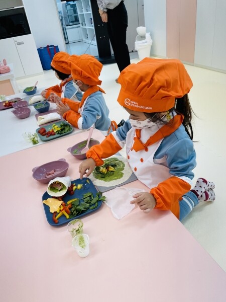 이번 어린이 조리 교실은 센터 등록급식소 어린이집 47명이 참석했으며 올바른 손 씻기 교육과 함께 아이들이 편식하기 쉬운 식재료 중 하나인 시금치와 친해지는 활동을 하고 시금치를 이용해 시금치 또르띠아 롤을 직접 만들어보는 활동을 진행했다.