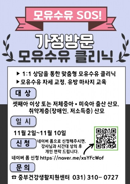 이에 가정방문 모유수유 클리닉 참여자를 10월 27일부터 10월 31일까지 모집 중이다.