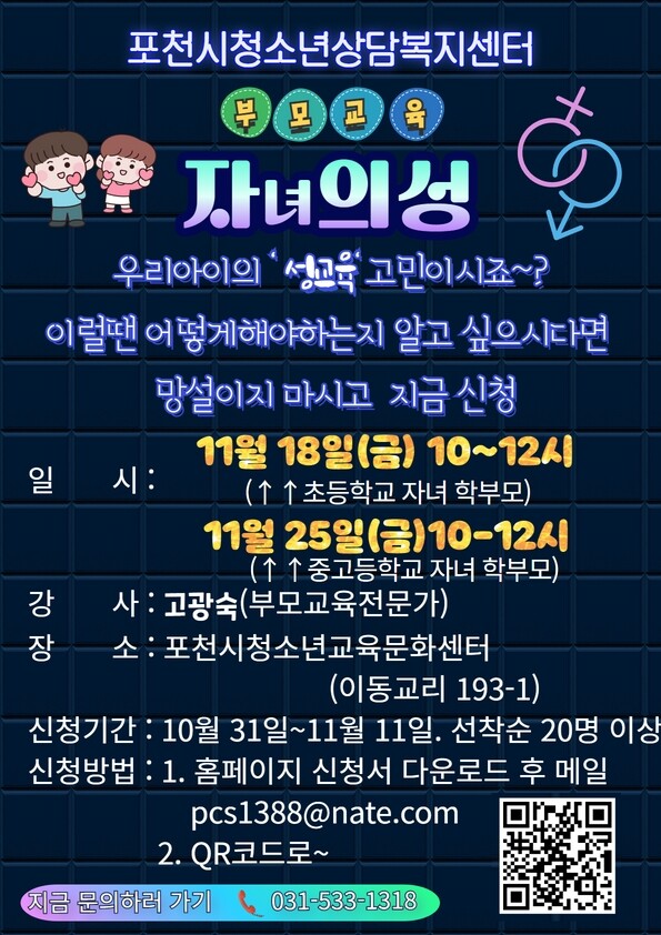 교육은 11월 18일과 25일 오전 10시부터 12시까지 포천시청소년교육문화센터 2층에서 1회씩 총 2차례 진행한다.