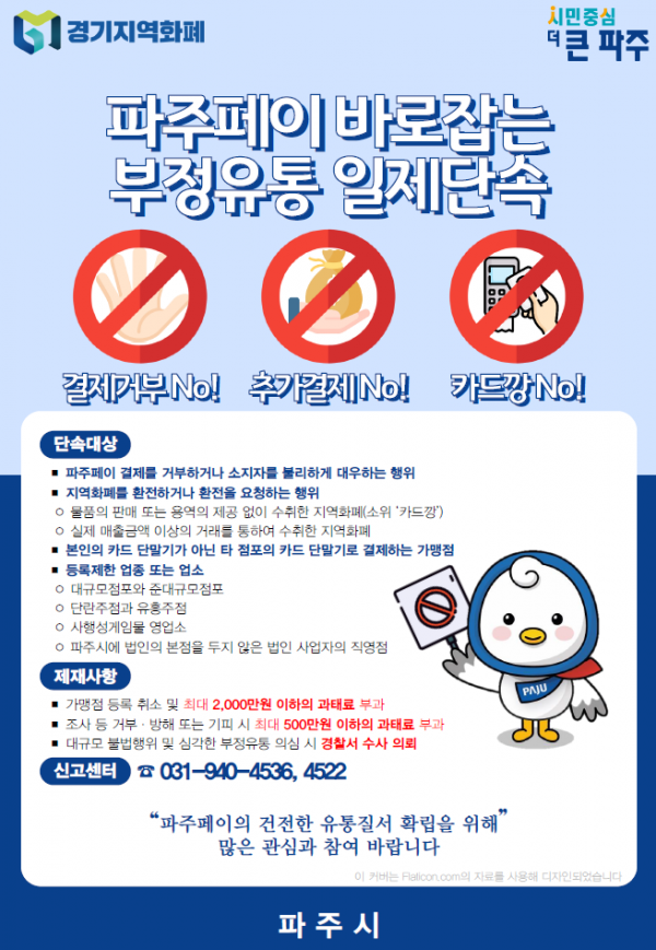 정훈수 일자리경제과장은 “지역화폐가 지역 상권 활성화와 소상공인들에게 큰 도움을 주지만 소수의 부정유통 의심사례가 존재한다”며 “이번 단속을 통해 파주페이 부정유통을 근절해 건전한 유통질서를 확립하겠다”고 말했다.
