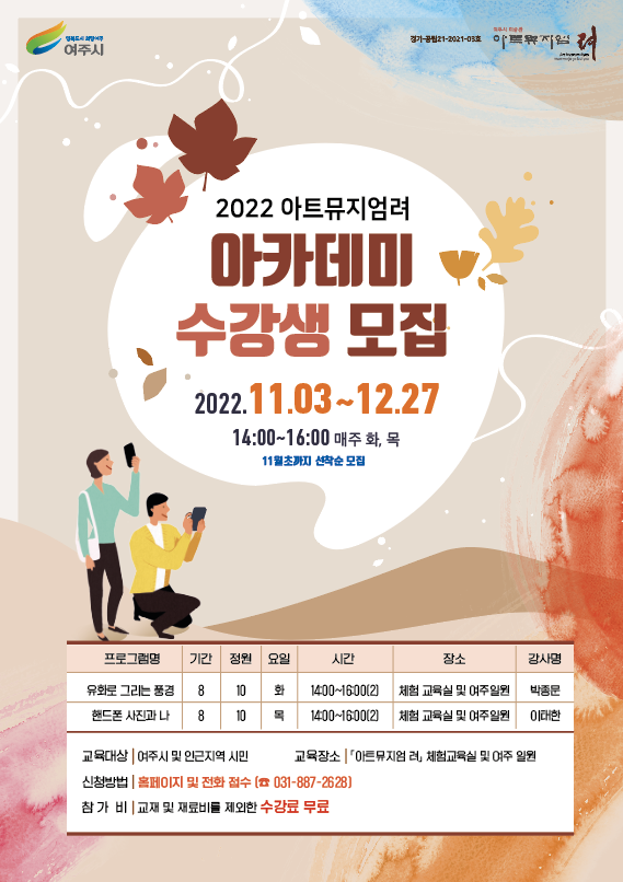 이번 프로그램의 참여대상은 여주시 및 인근지역 만 19세 이상의 시민으로 11월 6일까지 ‘아트뮤지엄 려’ 홈페이지에서 휴대폰 및 공공 아이핀 인증 후 예약이 가능하며 전화를 통한 예약도 가능하다.
