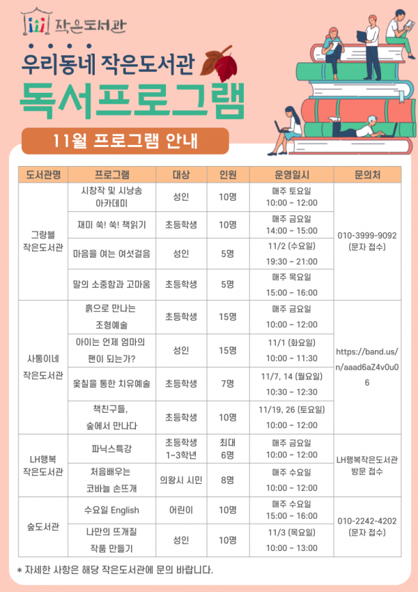 이번 프로그램은 행복작은도서관, 그랑블작은도서관, 숲도서관, 사통이네작은도서관에서 진행되며 어린이부터 성인까지 다양한 연령대가 함께 참여할 수 있는 프로그램으로 운영된다.