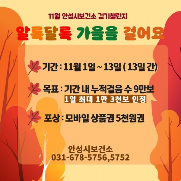 나경란 안성시보건소장은 “단풍으로 물들어가는 계절을 즐기며 걷기로 건강한 생활을 실천하시길 바란다”고 전했다.
