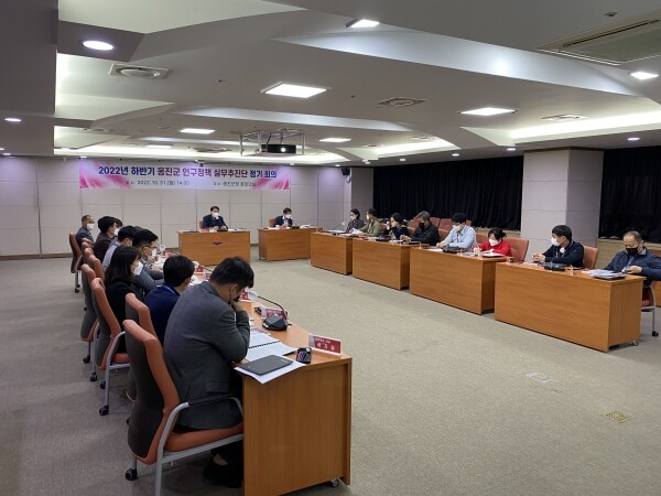 2022년 하반기 옹진군 인구정책 실무추진단 정기회의는 행정복지국장을 단장으로 총 5개 분야, 13개 부서 20명이 참석해 민선8기 군정의 성공적 도약과 인구 3만을 향한 지속 가능한 성장 발판을 마련하기 위해 개최됐으며 분야별 맞춤형 정책 관리를 위해 일자리·경제 분야 주거·교통 분야 아동·보육·교육 분야 문화·복지분야 총괄지원 분야 총 5개 분야로 구성되어 신규사업 발굴 8건, 주요사업 강화실적 2건,‘인구감소지역 지원 특별법’에 따른 특례조항 검토 26건, 현년도 인구정책 주요사업 추진실적 33건에 대해 논의하고 인구정책 실무추진단 구성원 모두가 한마음이 되어 인구 3만명을 향해 행정력을 집중했다.