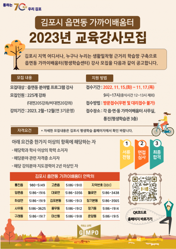 강사 지원 희망자는 이달 15일부터 17일까지 강사지원서 등의 증빙서류를 준비해 각 읍·면·동 가까이배움터 사무실로 직접 접수하면 된다.