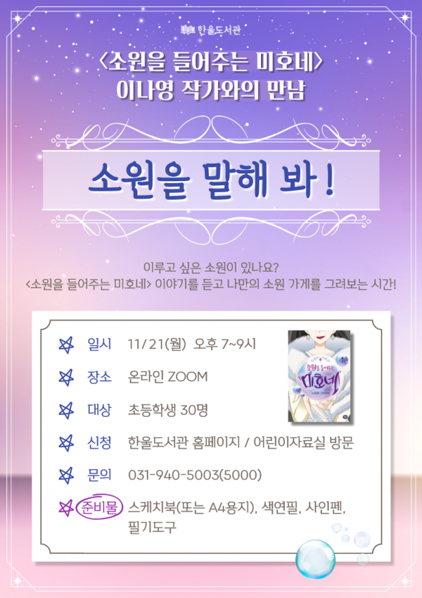 도서 전시에는 ‘소원을 들어주는 신비한 가게’를 소재로 담은 판타지 동화들이 전시되며 전시 도서 중 ‘소원을 들어주는 미호네’의 저자인 이나영 작가를 초청해 작가와의 만남을 운영한다.