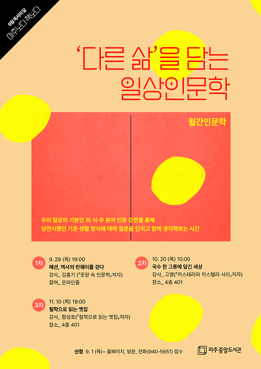 인문 강연은 당연시되고 사소하게 여겨져 깊이 들여다보기 쉽지 않았던 일상의 분야에 대해 들여다보는 시간을 제공하기 위해 기획했으며 9월부터 11월까지 매달 진행하고 있다.