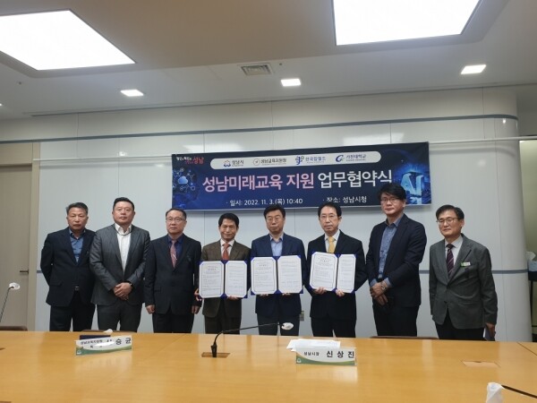 이를 위해 성남교육지원 교육장은 성남시장과 함께 11월 3일 성남시청에서 한국잡월드 이사장, 가천대학교 수석부총장 등이 참석한 가운데 ‘성남미래교육 지원사업 추진을 위한 협약’을 체결했다.