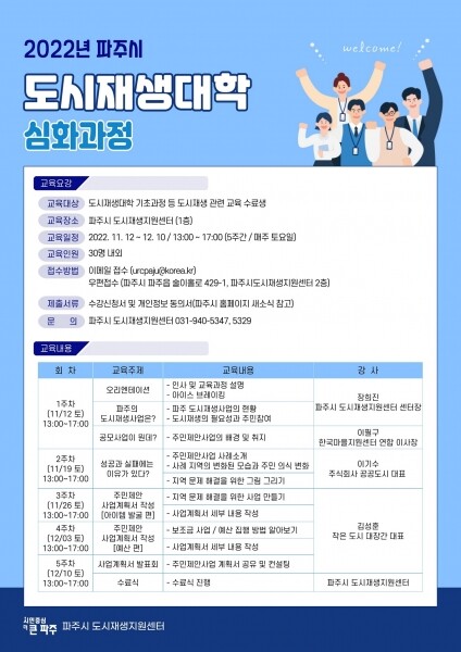 강좌는 파주시 도시재생 사업과 공모사업의 이해 주민제안 사업계획서 작성 실습 사업계획서 발표 및 수료식 등으로 진행될 예정이다.