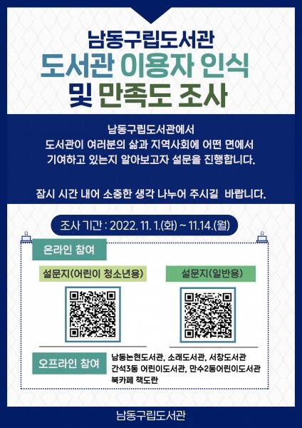 이번 조사는 남동구립도서관 홈페이지를 통해 참여하거나 구립도서관 5개관 및 남동구청 내 북카페 책도란 등을 방문해 참여할 수 있다.