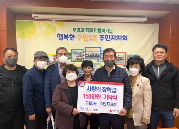 구월3동 주민자치회는 경제적으로 어려운 환경 속에서도 학업의 끈을 놓지 않는 학생들에게 도움이 되고자 해마다 총 300 만원 상당의 장학금을 정기적으로 후원해오고 있다.