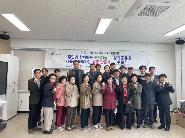 이날 여주시 관계자 및 지역주민이 참석한 가운데 수료식과 성과공유회가 진행됐으며 중앙동2지역 도시재생대학 기본과정 수강생 중 15명이 수료하는 성과를 거뒀다.
