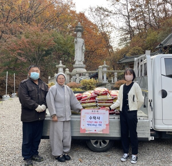 정희종 송산1동장은 “항상 주변 이웃을 생각하고 지속적인 나눔을 실천해주시는 정묘스님과 수락사 신도분들께 진심으로 감사드린다”며 “앞으로도 이웃 나눔을 실천하고 다 함께 행복한 송산1동이 되도록 최선을 다하겠다”고 밝혔다.