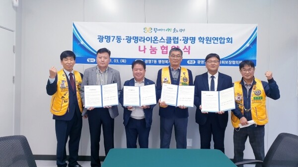 김주욱 광명7동장은 “광명7동을 위한 나눔 협약에 동참해준 두 분 대표와 위원장에게 감사드린다”며 “앞으로도 다양한 자원 발굴을 통해 기부와 나눔 문화를 확산해 훈훈한 온기가 가득한 광명7동을 만들기위해 노력하겠다”고 전했다.